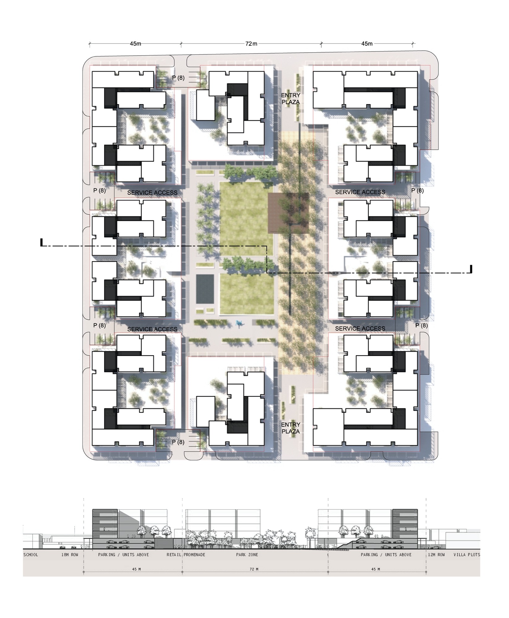 A plaza, comprised of reflective water pools and retail kiosks, interrupts a linear market running alongside the highway. It provides initial glimpses of the landscape. At the foot of the plaza, one can observe the beginning of a tree lined promenade running the whole length of the park, providing a continuous shaded canopy above a water stream (falaj). The park is a sanctuary, a respite from the noise and visual clutter. It is designed for the arid climate and is both low maintenance and highly efficient in water use by incorporating park-wide features such as indigenous plant species, on-site storm water filtration/infiltration, and a landscaping plan that maximizes comfort and activities for the visitors.