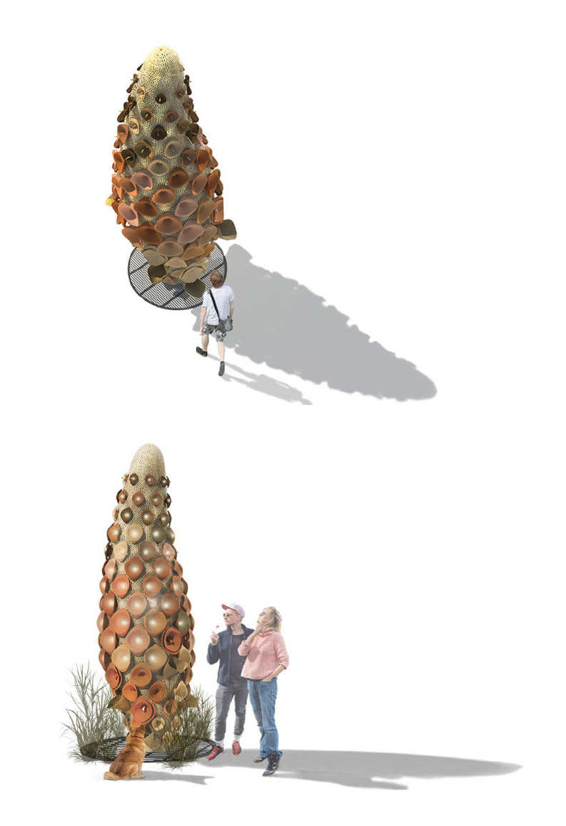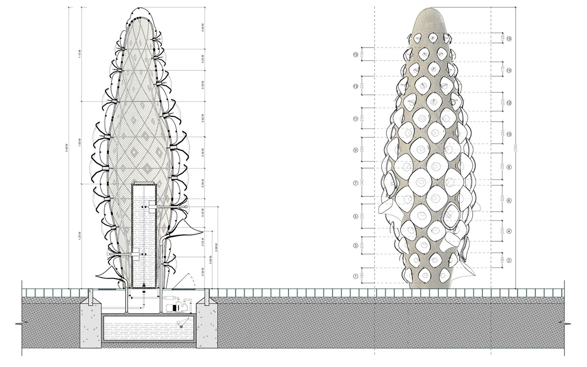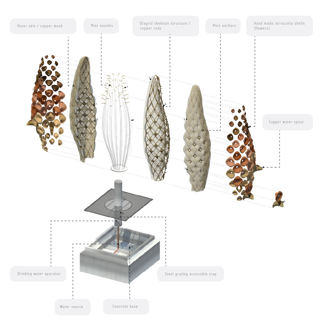 Water Flora is a proposal for a contemporary drinking water fountain that pays homage to traditional materials and techniques of making reservoirs and cooling water. The design draws inspiration from nature and from the desert. The form is inspired by the Desert Hyacinth or the “Al Thanoon” as referred to in Arabic, a plant native to the Gulf Peninsula known to the natives for its medicinal benefits. The concept offers a playful twist on the traditional use of clay for cooling purposes. One can find references to this in various parts of the world. The natural properties of clay and its historic association with the notion of drinking or storing water was a primary driving motive in the development of the design concept.